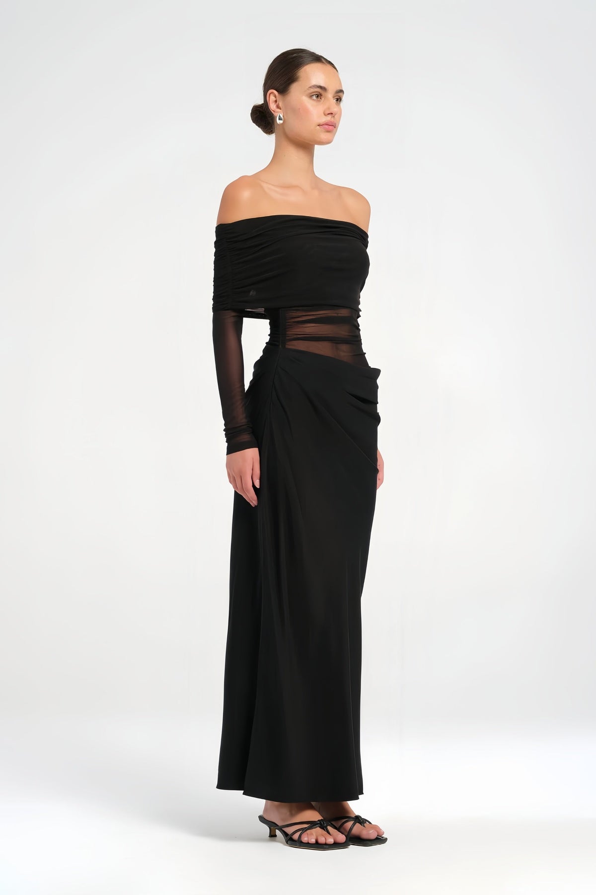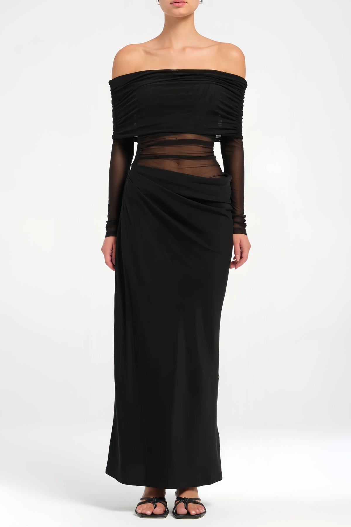 Šaty Estelle představují éterický a sofistikovaný outfit pro nezapomenutelné večery. Výstřih s odhalenými rameny a široké poloprůhledné rukávy vytvářejí romantický a jemný vzhled, zatímco tylové panely a měkké záhyby zvýrazňují siluetu s elegancí.