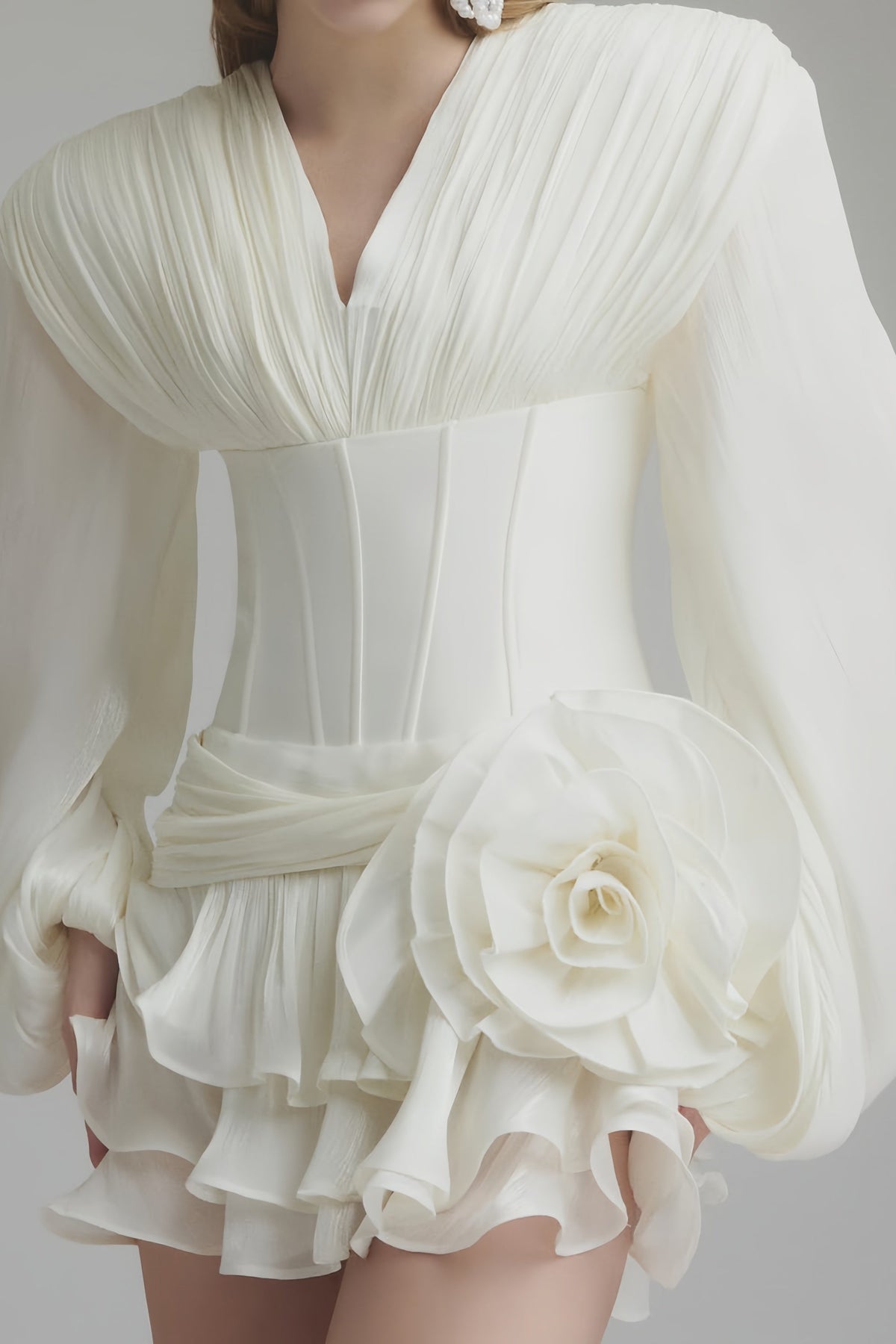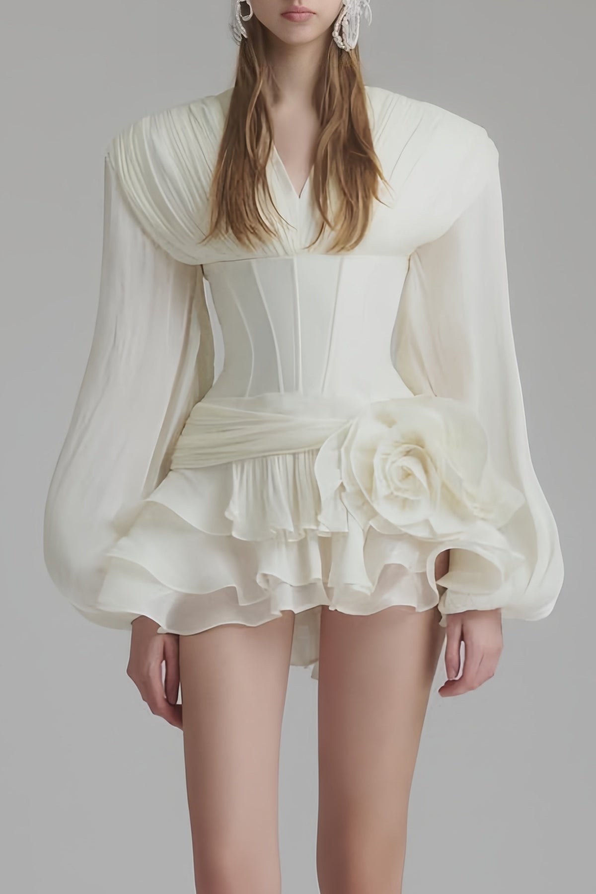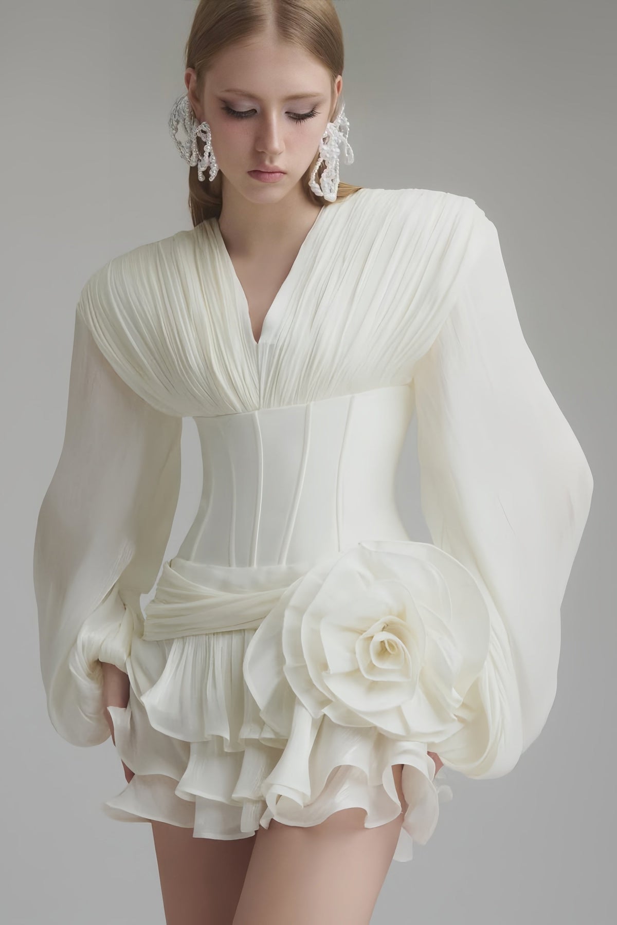 Šaty Rosier představují romantický a sofistikovaný outfit pro zvláštní příležitosti. Výstřih do V s jemnými květinovými aplikacemi, široké rukávy s knoflíky na manžetách a přiléhavý pas vytvářejí ženskou a elegantní siluetu.